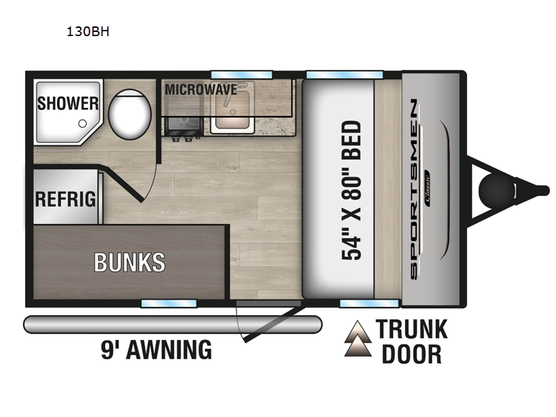 Inside, the KZ Sportsmen Classic 130BH comfortably accommodates up to four people, ensuring a restful night's sleep after a day of exploration. The intelligently designed layout includes a cozy bunk bed setup, a convertible dinette, and ample storage space to keep your essentials organized. The interior height of approximately 2 meters allows for comfortable movement, while the overall width of 2 meters ensures a stable and secure ride. The trailer is equipped with essential amenities, including a compact kitchenette with a refrigerator, a two-burner cooktop, and a microwave, allowing you to prepare meals with ease.
