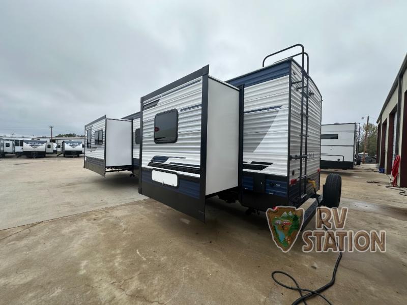 The Palomino Puma 31FKRK features two slide-outs, significantly enhancing the living area and providing a generous layout that can comfortably accommodate up to six people. The intelligently designed floor plan includes a well-appointed kitchen, complete with modern appliances and ample storage, ensuring meal preparation is both convenient and enjoyable. The living area is equipped with plush seating, creating a cozy atmosphere for relaxation after a day of exploration.