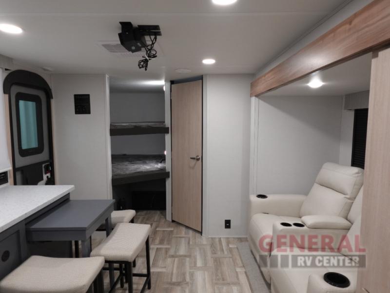 Designed to sleep up to six people, this RV is ideal for family outings or group trips. The intelligently laid-out interior includes a cozy sleeping area, a convertible dinette, and a set of bunk beds, ensuring everyone has a comfortable place to rest. The modern kitchen is equipped with essential appliances and ample storage, making meal preparation a breeze. The well-appointed bathroom offers convenience and privacy, enhancing your travel experience.