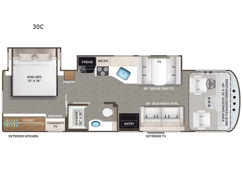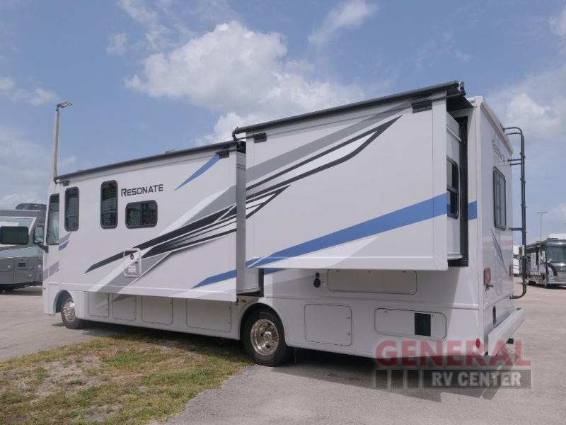 This RV features two spacious slide-outs that expand your living area, creating a roomy and inviting atmosphere. With the ability to sleep up to eight people, it's ideal for family vacations or group getaways. The thoughtfully designed interior includes a fully equipped kitchen, a cozy dining area, and a comfortable lounge space, making it easy to relax and unwind after a day of exploration. The Resonate 30C also boasts a modern bathroom with all the conveniences of home, ensuring your travels are as comfortable as they are exciting.