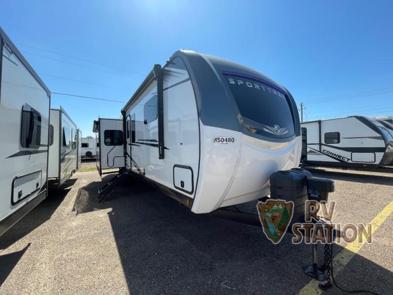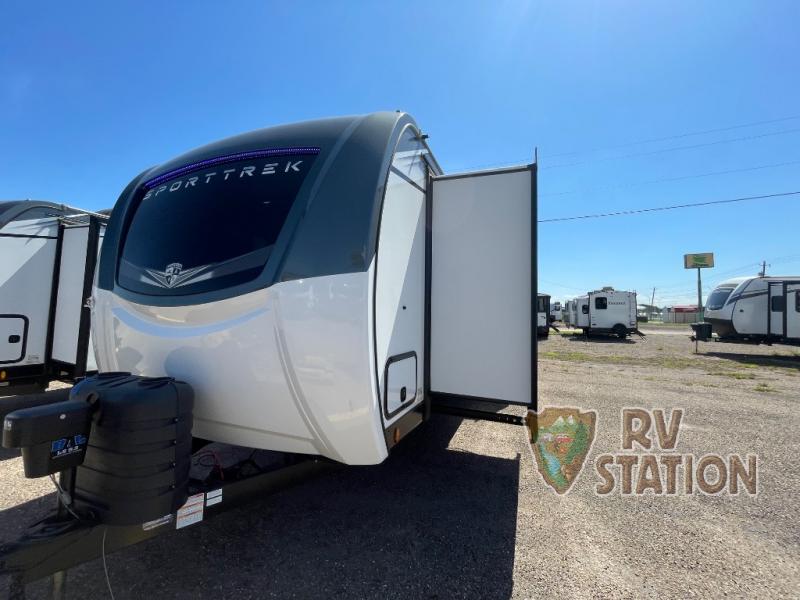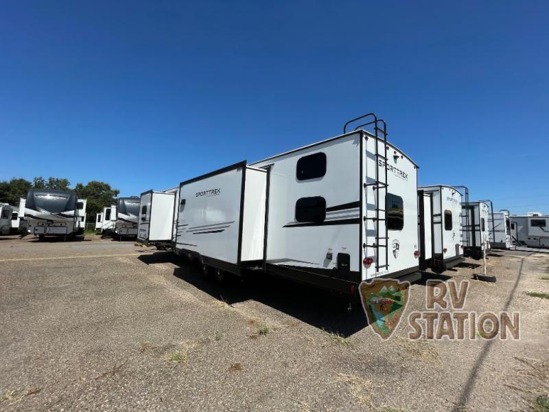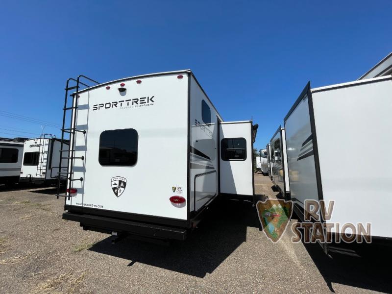 Introducing the 2025 Venture RV SportTrek Touring Edition STT343VIB Travel Trailer, a perfect blend of luxury and functionality for your next adventure. This spacious travel trailer features three slide-outs, providing ample room for the whole family or a group of friends. With a length of 32 feet, it offers a comfortable and inviting living space that can accommodate up to nine people, making it ideal for family vacations or group getaways.