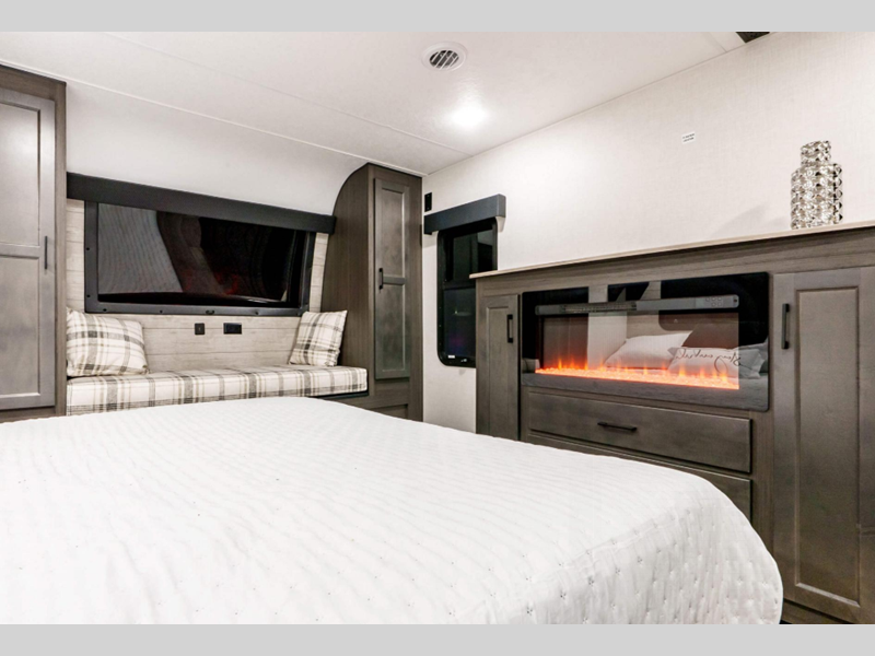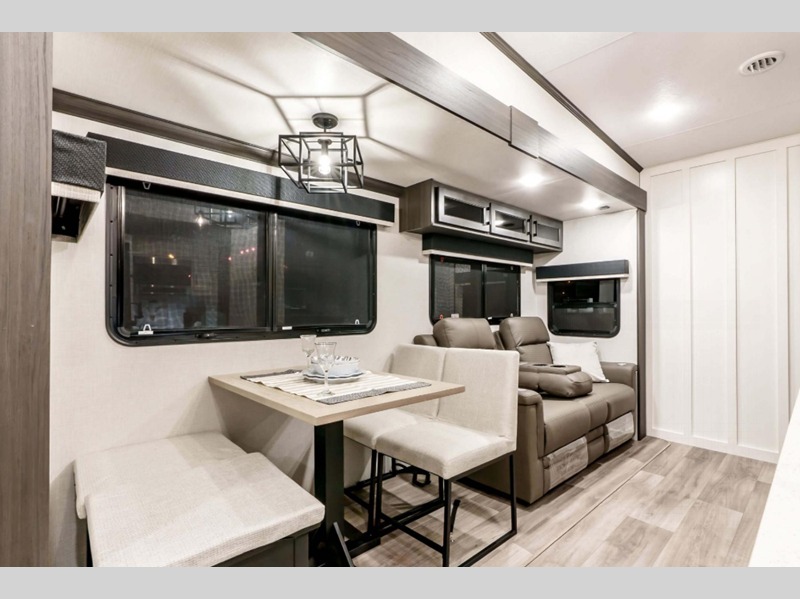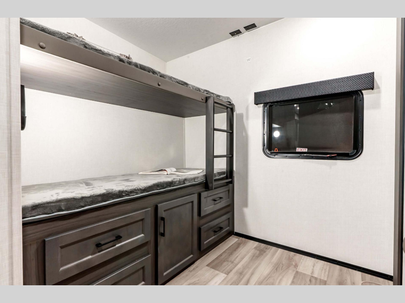 Inside, the SportTrek 354VBH boasts a thoughtfully designed floor plan that maximizes space and convenience. The interior features a spacious living area with plush seating and a state-of-the-art entertainment system, perfect for relaxing after a day of exploration. The kitchen is equipped with modern appliances, including a refrigerator, microwave, and stove, all seamlessly integrated into the design. The dining area comfortably accommodates family meals, while the luxurious master bedroom offers a serene retreat with a queen-sized bed and ample storage. Additionally, the bunkhouse provides extra sleeping space, making this RV ideal for families or groups.