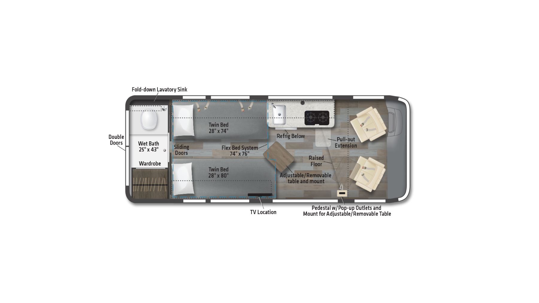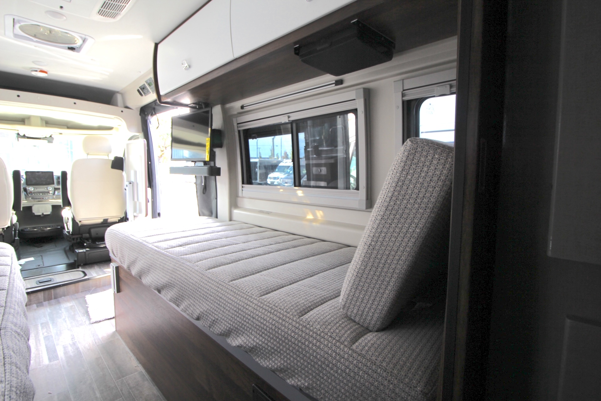 Step inside to discover a thoughtfully designed interior that maximizes space and functionality. The Travato 59K features a twin bed layout that easily converts into a king-size sleeping area, offering flexibility and comfort. The fully equipped kitchen boasts a two-burner stove, a microwave oven, and a refrigerator with a capacity of 141 liters, allowing you to prepare meals with ease. The wet bath includes a shower, sink, and toilet, providing all the conveniences of home. With a fresh water tank capacity of 91 liters, a grey water tank of 79 liters, and a black water tank of 53 liters, you can enjoy extended stays off the grid.