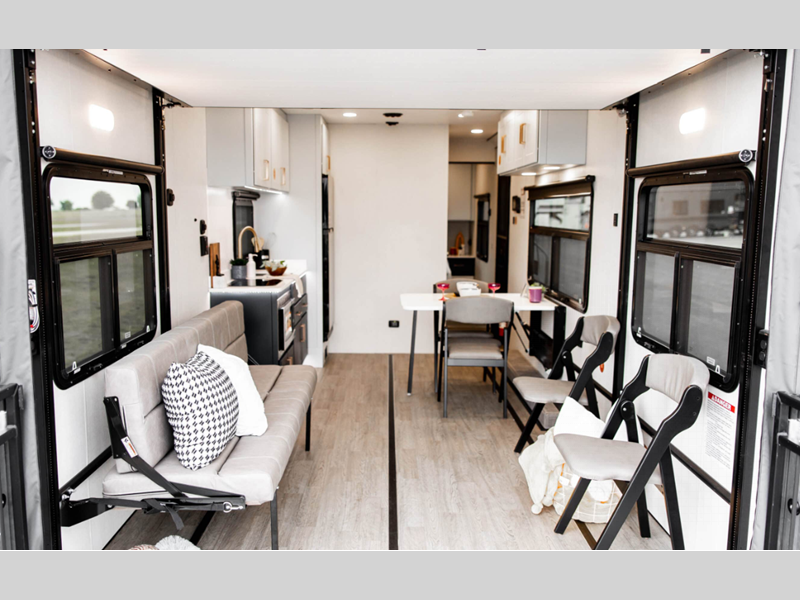 Weighing in at approximately 3,904 kilograms, the PLA 550 2816 is engineered for durability and ease of towing, making it an ideal choice for both seasoned travelers and newcomers to the RV lifestyle. Its robust construction ensures stability and safety on the road, while the sleek, modern design promises to turn heads at every stop. Inside, the ToyHauler comfortably sleeps two, providing a cozy and intimate retreat after a day of exploration. The well-appointed interior features high-quality finishes and thoughtful amenities, ensuring a comfortable and convenient living space.
