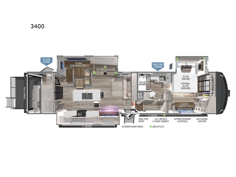 The Brinkley Model Z 3400 features three expertly crafted slide-outs, enhancing the interior space to create a truly expansive living environment. This thoughtful design allows for a seamless blend of style and practicality, ensuring that every journey is as comfortable as it is memorable. With accommodations to sleep up to four individuals, this RV is perfect for families or couples seeking a luxurious escape. The interior is meticulously appointed with high-quality materials and finishes, providing a sophisticated ambiance that rivals that of a high-end hotel suite.