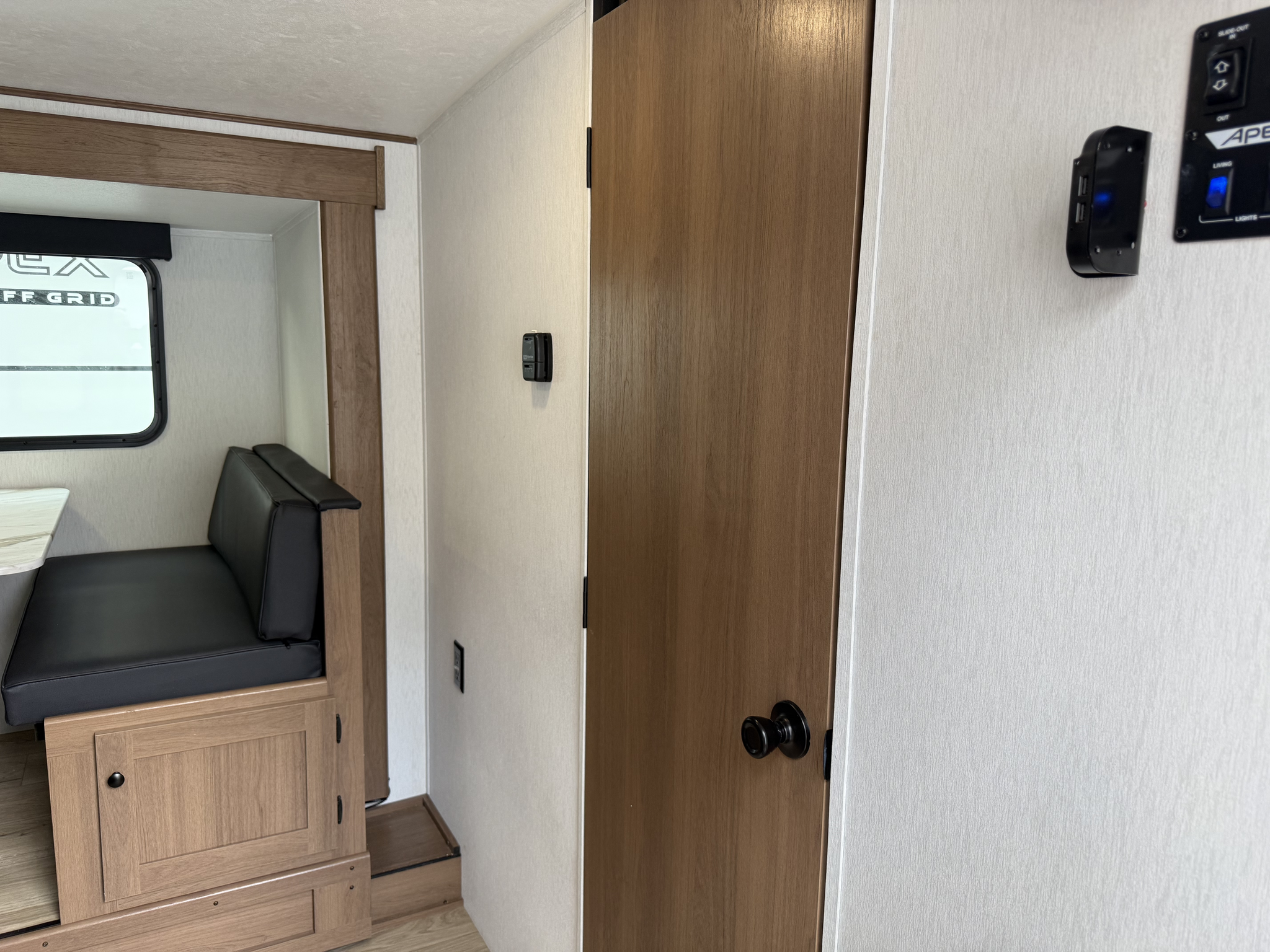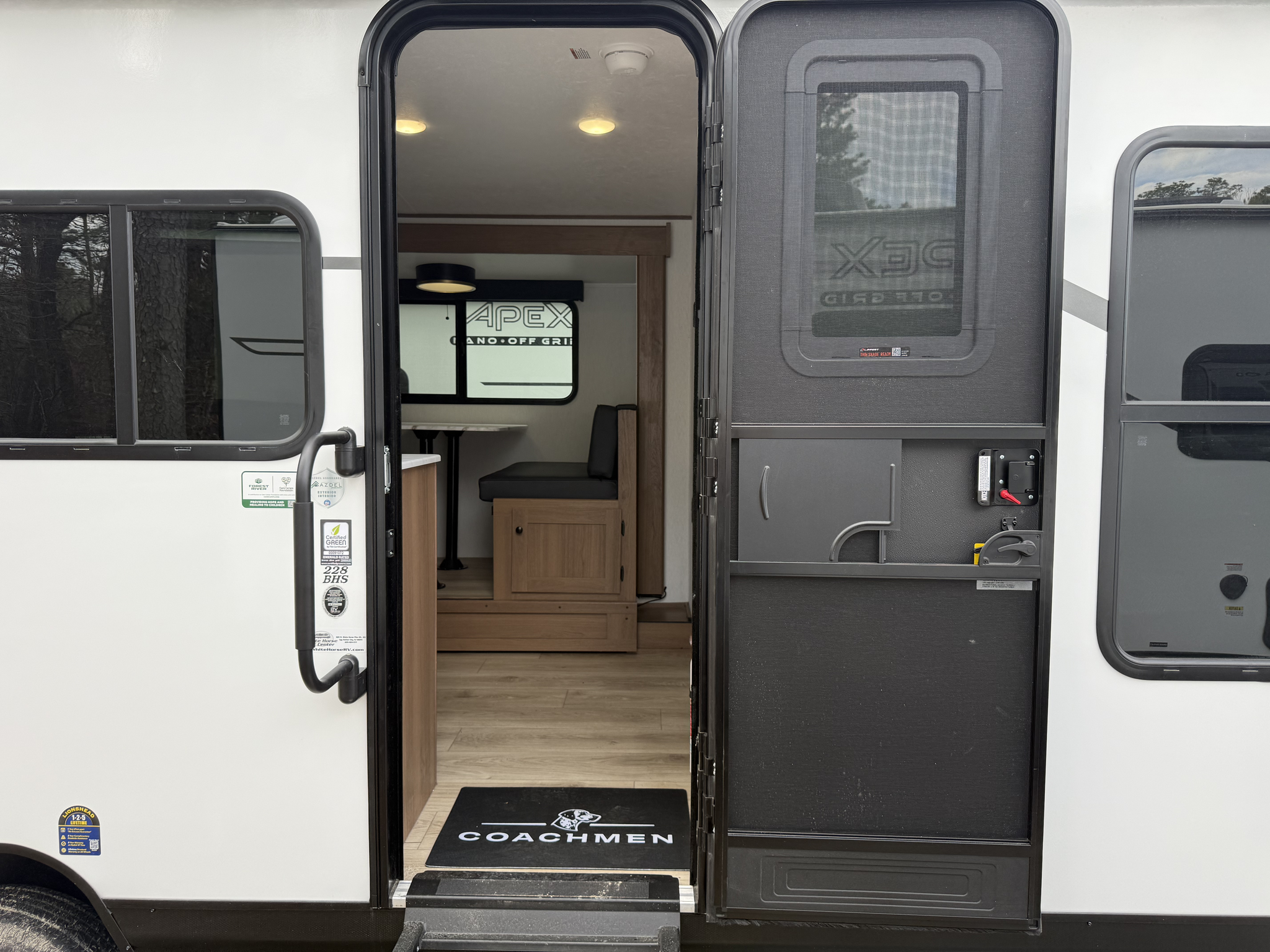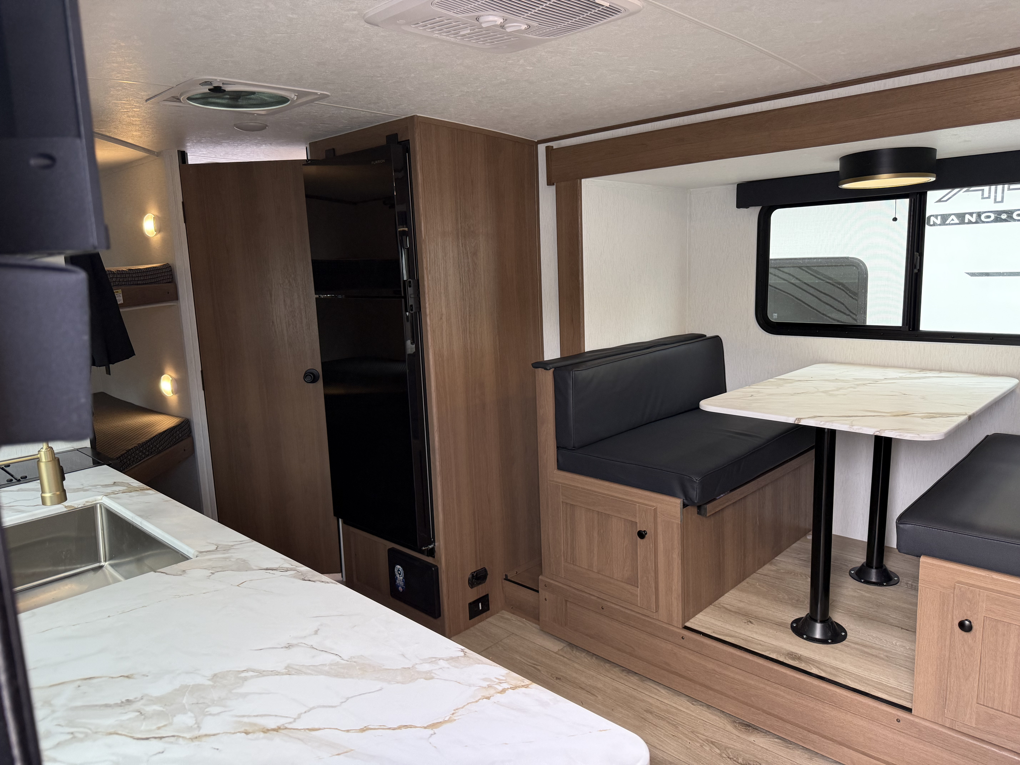 The Apex Nano 228BHS features a smart layout with one slide-out, maximizing the interior space to comfortably sleep up to seven people. Inside, you'll find a cozy queen bed, double bunk beds, and a convertible dinette, ensuring everyone has a comfortable place to rest after a day of exploration. The well-equipped kitchen includes a refrigerator, microwave, and two-burner stove, allowing you to prepare meals with ease. The bathroom offers a shower and toilet, providing all the conveniences of home.