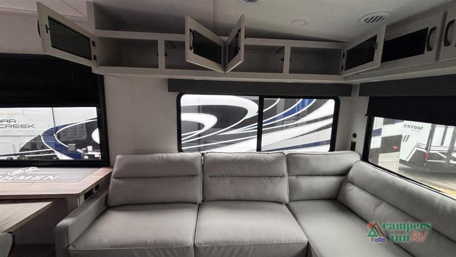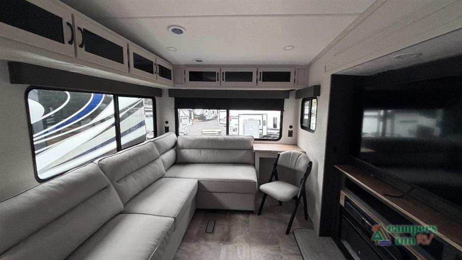 This fifth wheel boasts three expansive slide-outs, significantly enhancing the living space to accommodate up to ten people comfortably. Whether you're embarking on a weekend getaway or an extended road trip, the Phoenix 27BAR ensures everyone enjoys a restful night's sleep. The thoughtfully designed interior features high-quality furnishings and state-of-the-art appliances, providing all the conveniences of home. The spacious kitchen, equipped with modern amenities, allows for effortless meal preparation, while the inviting living area is perfect for relaxation and entertainment.
