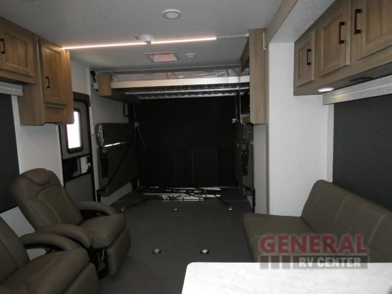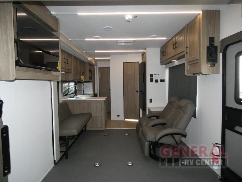 Designed to sleep up to seven people, this toy hauler is ideal for family trips or group adventures. The thoughtfully designed layout maximizes space and comfort, providing cozy sleeping arrangements for everyone. With a fuel capacity of 114 liters, you can venture further without frequent refueling stops, making it perfect for long road trips or off-the-grid escapades. The RV's length is 30 feet, offering a compact yet roomy environment that is easy to maneuver and park.
