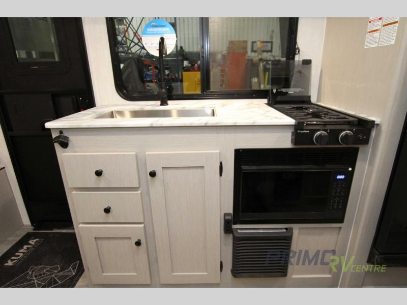 Inside, the Apex Nano 185BH is thoughtfully designed to maximize space and functionality. The sleeping arrangements are well-planned, featuring a cozy queen-sized bed, a set of bunk beds, and a convertible dinette, ensuring everyone has a comfortable place to rest after a day of adventure. The interior is equipped with modern amenities, including a fully functional kitchenette with a two-burner stove, a microwave, and a refrigerator, allowing you to prepare meals just like at home. The bathroom is compact yet efficient, featuring a shower and toilet to meet all your needs.
