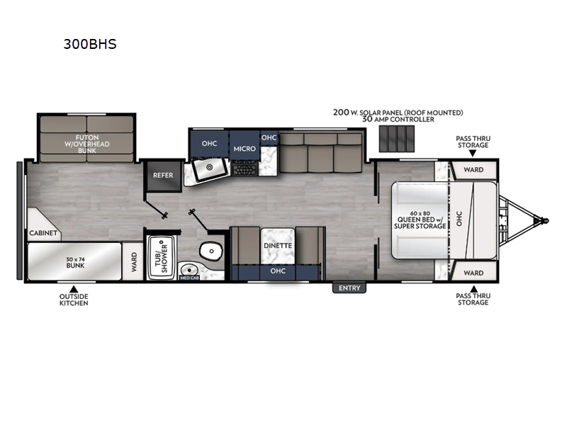 Measuring approximately 28 feet in length, the Apex Ultra-Lite 300BHS is thoughtfully designed to maximize space and functionality. It comfortably sleeps up to seven people, making it ideal for family vacations or trips with friends. The interior layout is both stylish and practical, featuring a cozy living area, a fully-equipped kitchen, and a private sleeping space. The clever design ensures everyone has their own space to unwind after a day of adventure.