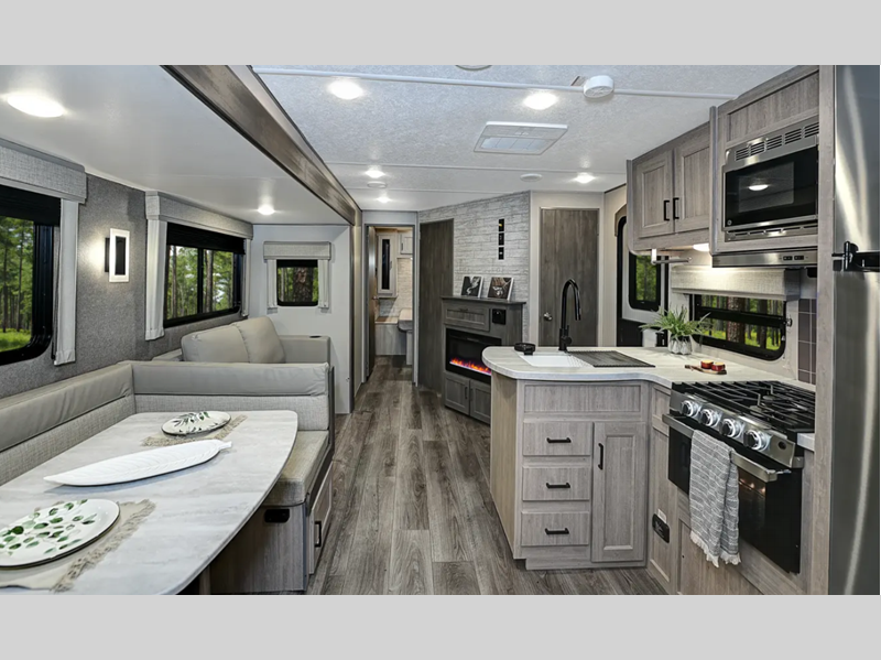 Step inside to discover a thoughtfully designed interior that maximizes space and functionality. The living area is equipped with modern amenities, ensuring a comfortable stay no matter where your travels take you. The kitchen comes fully equipped with essential appliances, allowing you to prepare meals with ease. The sleeping arrangements are versatile, featuring a master bedroom, bunk beds, and convertible furniture to accommodate everyone comfortably.
