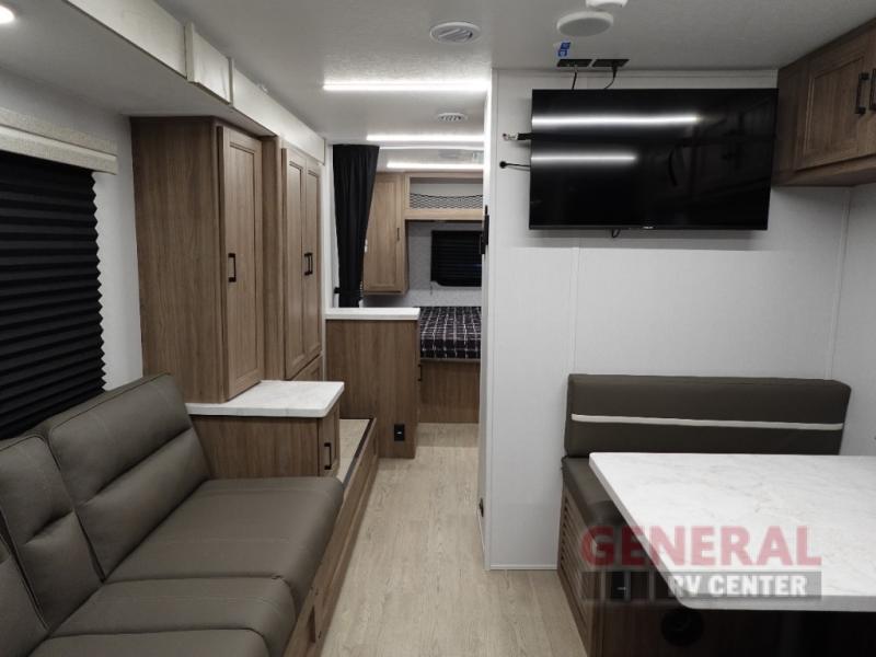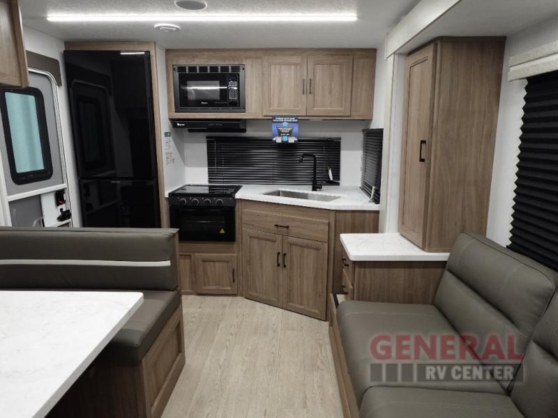 Inside, you’ll find a cleverly designed layout that can comfortably sleep up to four people. Whether you’re traveling with family or friends, everyone will have their own cozy space to relax after a day of exploring. The single slide-out expands the living area, giving you extra room to stretch out and enjoy your time indoors. The interior is modern and stylish, with all the amenities you need for a comfortable stay, including a fully equipped kitchen and a spacious bathroom.