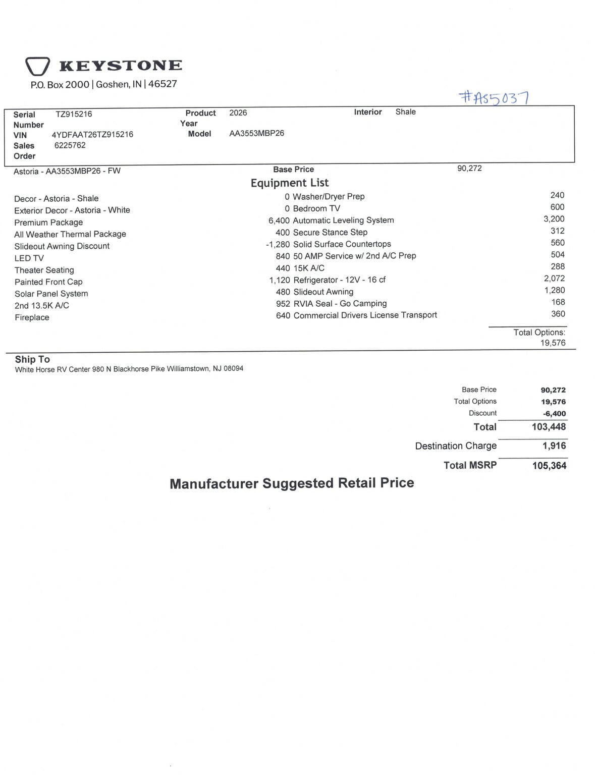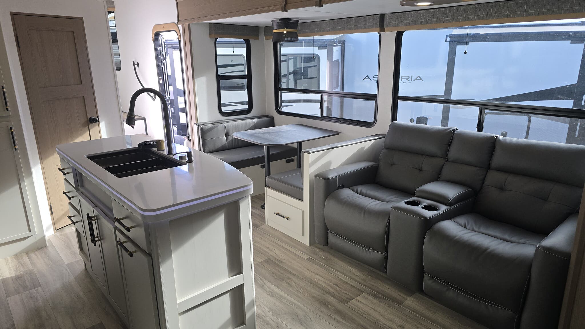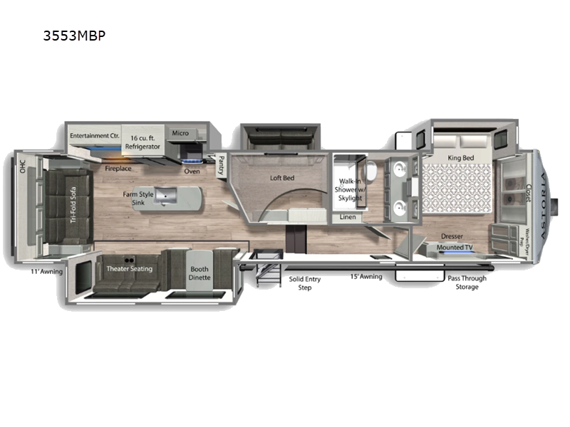 Inside, you'll find a modern kitchen equipped with all the essentials, a spacious living area perfect for entertaining, and a bathroom that offers the convenience of home. Whether you're cooking a meal, watching a movie, or simply enjoying the view from your campsite, the Astoria's thoughtful design and high-quality finishes make every moment enjoyable. Don't miss the chance to own this incredible RV and create unforgettable memories on the road. Your next adventure awaits with the 2026 Dutchmen Astoria 3553MBP!