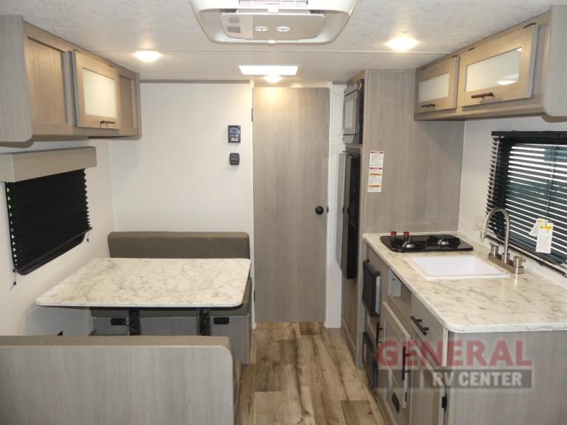 Inside, the Aspen Trail Mini 17RB is thoughtfully designed to maximize space and functionality. It comfortably sleeps up to three people, making it perfect for couples or small families. The interior boasts a cozy sleeping area, a well-equipped kitchenette, and a compact yet efficient bathroom, ensuring you have everything you need for a comfortable stay. The smart layout and modern amenities make it easy to relax and unwind after a day of exploration.