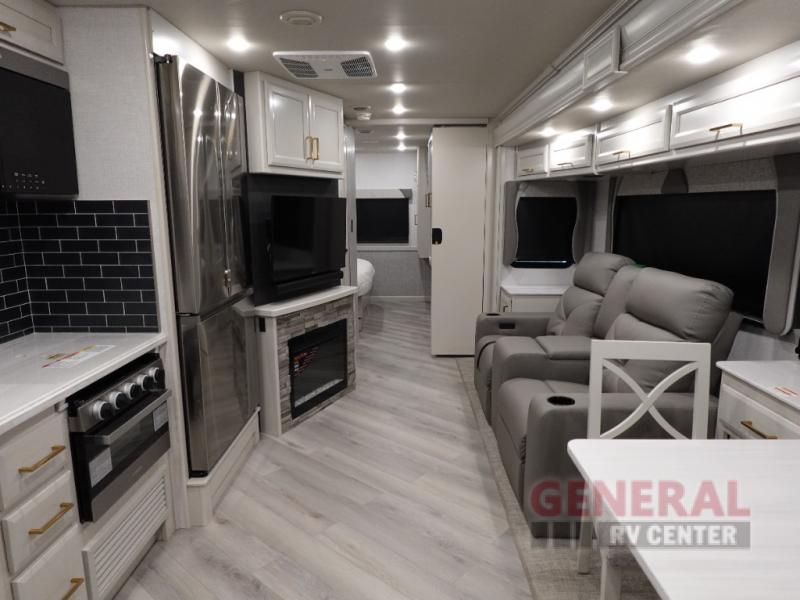 Equipped with two slide-outs, this RV maximizes interior space, creating a spacious living area that can comfortably accommodate up to four people. The well-appointed interior features premium furnishings and modern amenities, ensuring a luxurious experience wherever your travels take you. The thoughtfully designed kitchen is equipped with state-of-the-art appliances, allowing you to prepare gourmet meals with ease. The sleeping quarters offer a restful retreat, with plush bedding and ample storage to keep your belongings organized.