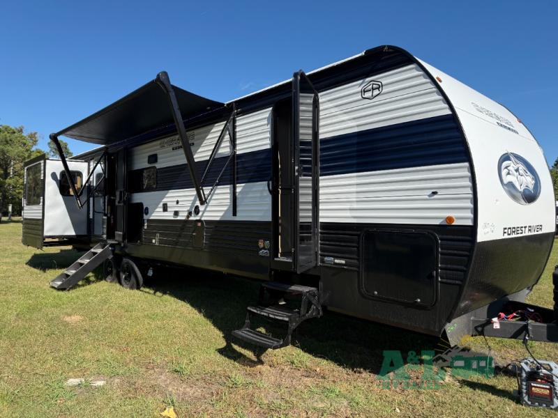 Measuring approximately 33 feet in length, the Cherokee Wolf Den is thoughtfully designed to maximize space and functionality. Inside, you'll find a well-appointed living area with modern amenities and cozy furnishings, ensuring everyone can relax after a day of exploration. The kitchen is equipped with everything you need to prepare delicious meals on the road, while the dining area provides a welcoming space to gather and enjoy them together.