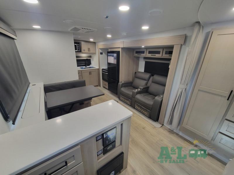 Featuring two slide-outs, the Flagstaff Micro Lite 25FBD offers an expansive interior that comfortably sleeps three. The intelligently designed layout maximizes space, providing a cozy sleeping area, a fully equipped kitchen, and a comfortable living area. Whether you're preparing a gourmet meal or relaxing after a day of adventure, this RV ensures you have everything you need at your fingertips. The modern amenities and high-quality finishes make it a true home away from home.
