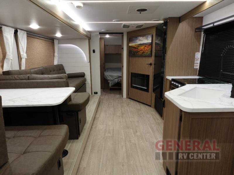 The Salem Cruise Lite 26ICE features one slide-out, significantly enhancing the living area to create a more open and inviting atmosphere. This model is thoughtfully designed to accommodate up to eight people, making it perfect for family trips or group outings. The interior is equipped with modern amenities and high-quality finishes, ensuring that every journey is as comfortable as it is memorable. The intelligently designed floor plan includes a fully equipped kitchen, a cozy dining area, and a comfortable sleeping arrangement, providing all the necessities for a pleasant stay.