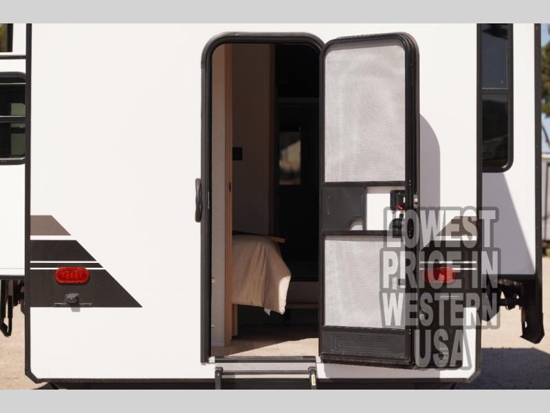 Step inside to discover a thoughtfully designed interior featuring two separate living areas, providing privacy and convenience. Each section is equipped with its own bedroom, bathroom, and living space, making it ideal for families or couples traveling together. The bedrooms boast queen-sized beds and generous storage, while the bathrooms feature modern fixtures and spacious showers. The fully equipped kitchen comes with a refrigerator, stove, and microwave, ensuring you have everything you need to prepare delicious meals on the road. The living areas are designed for relaxation, with comfortable seating and entertainment options to keep everyone entertained.