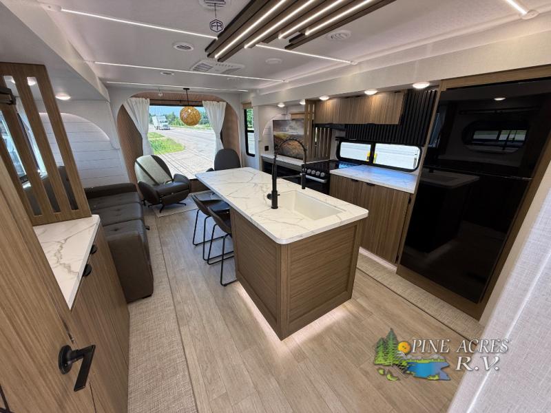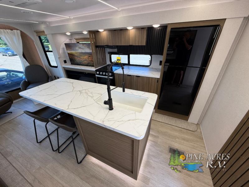 Step inside to discover a thoughtfully designed interior that maximizes space and functionality. The open floor plan features a spacious living area, complete with a convertible dinette and a comfortable sofa, providing versatile seating and sleeping arrangements. The fully equipped kitchen boasts modern appliances, including a refrigerator, microwave, and three-burner stove, all seamlessly integrated into the sleek cabinetry. The master bedroom offers a tranquil retreat with a queen-sized bed, ample storage, and privacy doors, ensuring restful nights after a day of exploration.
