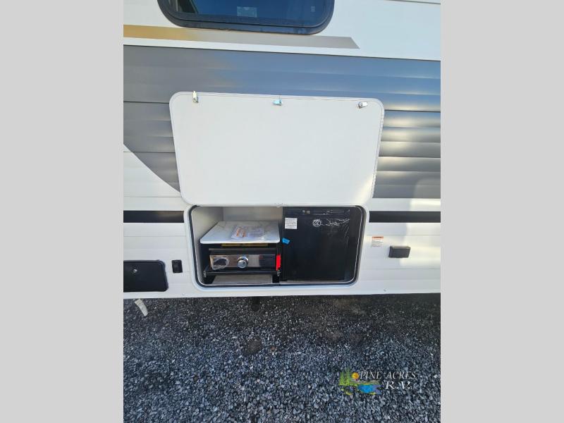 Measuring an impressive 28 feet in length, this RV offers plenty of room for everyone. The single slide-out expands the living area, providing a cozy yet open space for relaxation and entertainment. With the ability to sleep up to 9 people, this trailer is ideal for family trips or group getaways. The well-designed interior includes a comfortable master bedroom, a versatile bunkhouse for the kids, and a convertible dinette and sofa for additional sleeping options.