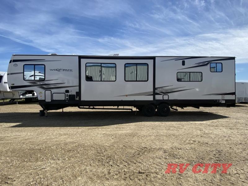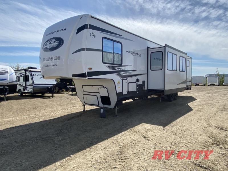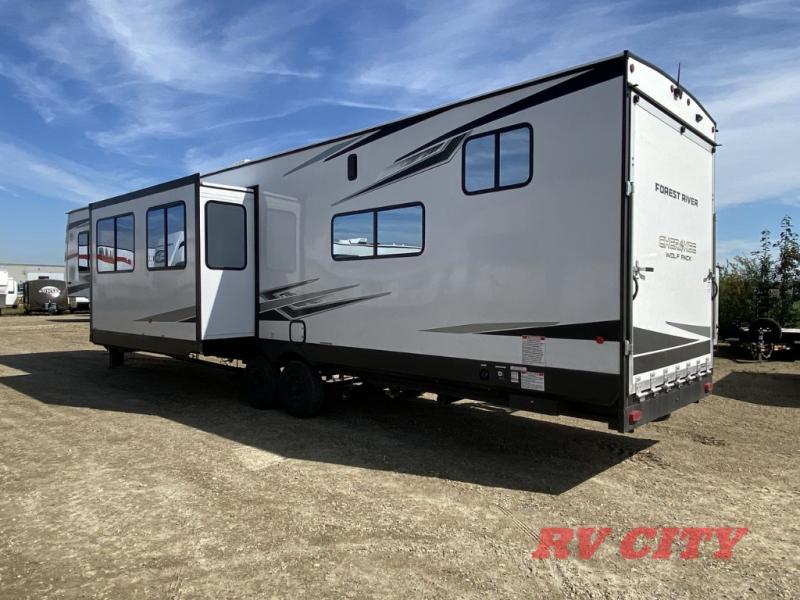 Introducing the 2026 Forest River RV Wolfpack Limited 352PACK15 Fifth Wheel, a remarkable blend of luxury, functionality, and adventure-ready design. This exceptional RV is crafted to elevate your travel experiences, offering a spacious and versatile environment for both short getaways and extended journeys. With an overall length of 44 feet, this fifth wheel is engineered to provide ample living space while ensuring ease of maneuverability.