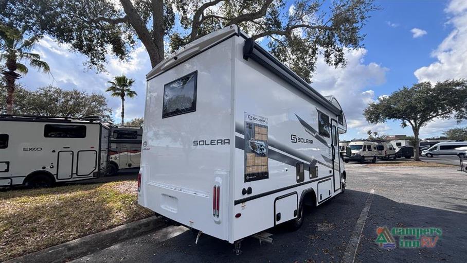 Step inside to find a spacious interior, thanks to the clever slide-out feature that expands your living space. The Solera 24SRB comfortably sleeps three, making it ideal for couples or small families. The cozy sleeping area ensures restful nights, while the well-equipped kitchen invites you to whip up your favorite meals on the go. With ample storage throughout, you can bring along all your essentials without feeling cramped. The RV's thoughtful layout maximizes every square meter, ensuring you have everything you need at your fingertips.