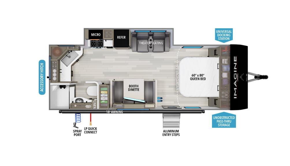 The Imagine XLS 22MLE features a single slide-out that expands your living space, providing ample room for relaxation and entertainment. Inside, you'll find sleeping accommodations for up to four people, making it perfect for family trips or a getaway with friends. The well-appointed interior includes a fully equipped kitchen with modern appliances, a cozy dining area, and a comfortable sleeping arrangement that ensures restful nights after a day of adventure.