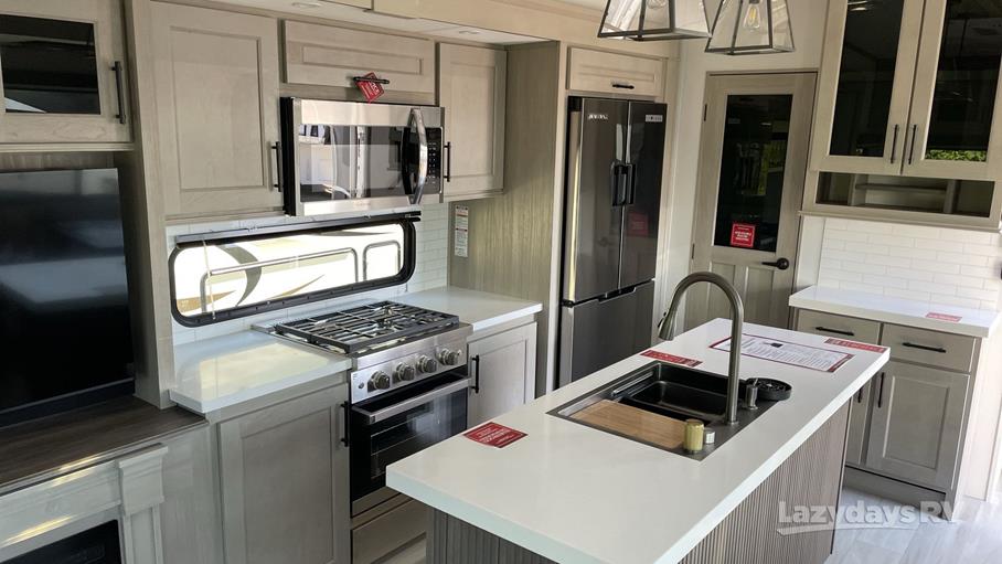 The interior of this fifth wheel is a testament to thoughtful design and quality craftsmanship. With four slide-outs, the living space is expansive, providing a generous area for relaxation and entertainment. The open-plan living area features plush seating, a state-of-the-art entertainment system, and a fully equipped kitchen with modern appliances, ensuring that you have all the comforts of home while on the road. The master bedroom offers a serene retreat with a comfortable bed and ample storage space, while the bathroom is designed with premium fixtures and finishes for a spa-like experience.