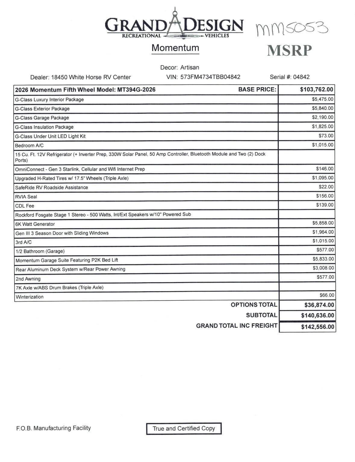 Weighing in at 10,215 kilograms, this RV is built for durability and stability, ensuring a smooth ride wherever your journey takes you. Plus, the toy hauler garage is perfect for bringing along your ATVs, bikes, or any other gear you need for your adventures. Don't miss out on the chance to own this incredible RV that's ready to make your travel dreams come true. Pack your bags, gather your crew, and hit the road in the 2026 Grand Design Momentum G-Class 394G ToyHauler!