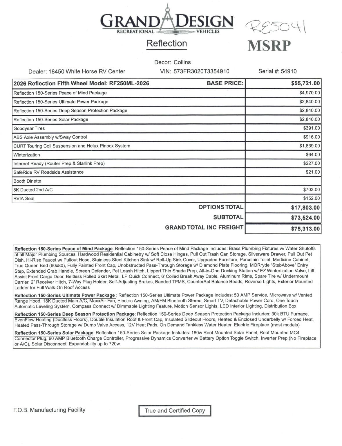 Inside, you will find a meticulously designed interior that exudes elegance and comfort. The living space is adorned with high-quality finishes and modern amenities, ensuring a home-like atmosphere wherever your travels take you. Whether you're embarking on a weekend getaway or an extended journey, the 2026 Grand Design Reflection 150 Series 250ML Fifth Wheel promises an unparalleled RV experience, combining the freedom of the open road with the comforts of home. Embrace the adventure and make this exceptional RV your trusted companion on your next journey.