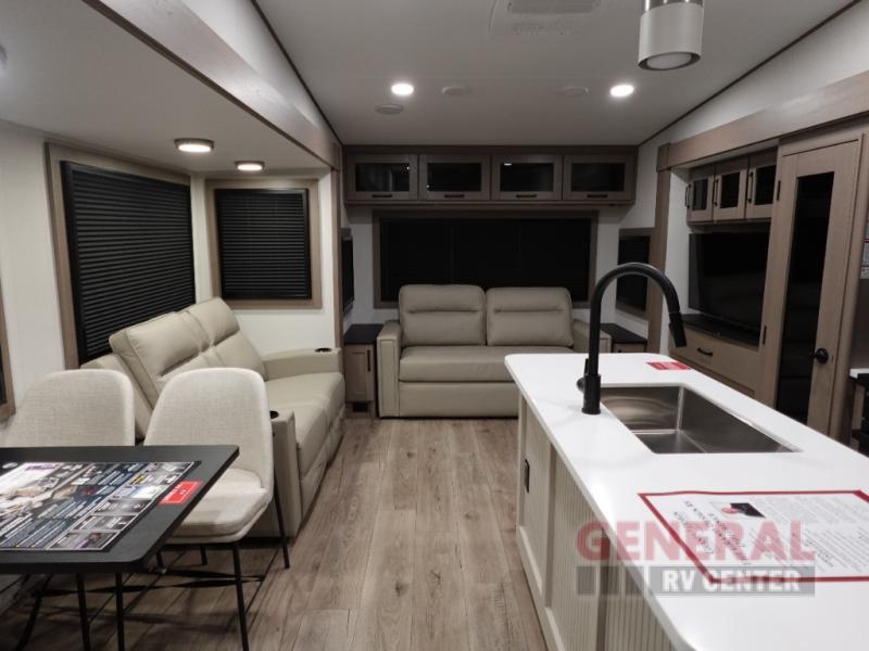 Inside, the Reflection 337RLS can comfortably sleep up to five people, making it perfect for family adventures or trips with friends. The intelligently designed floor plan maximizes space and functionality, featuring a well-appointed kitchen, a cozy living area, and a comfortable sleeping arrangement. The interior is crafted with high-quality materials and finishes, providing a sense of luxury and durability that will stand the test of time. Whether you're preparing a meal or relaxing after a day of exploration, this RV offers all the amenities you need for a home-like experience on the road.
