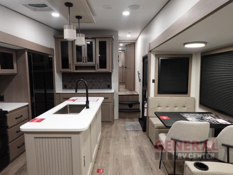 The Reflection 337RLS features three expansive slide-outs, significantly enhancing the living space and providing a sense of openness that is rare in mobile living. The interior is elegantly appointed with high-quality materials and finishes, offering a sophisticated ambiance that rivals many stationary homes. The well-equipped kitchen, complete with modern appliances and ample storage, allows for effortless meal preparation, while the inviting living area provides a comfortable space to relax and unwind after a day of exploration.