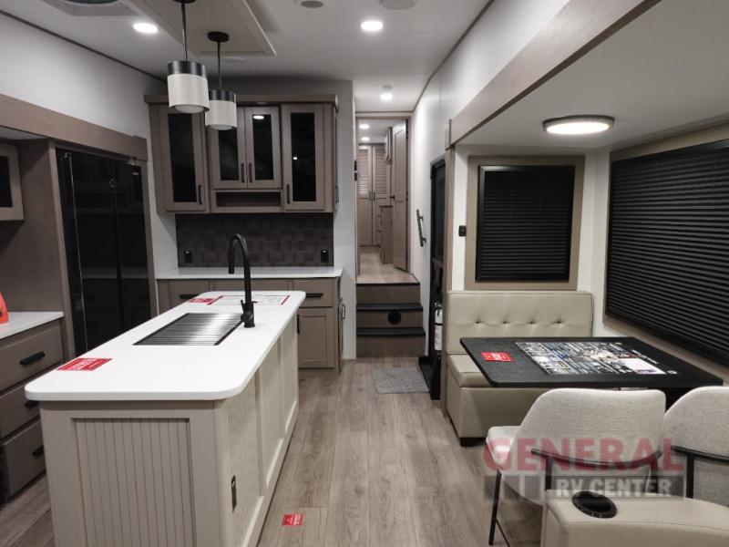 Inside, you'll find a thoughtfully designed space that comfortably sleeps up to five people. The master bedroom features a plush queen-sized bed, while the living area includes a cozy tri-fold sofa and a convertible dinette, perfect for accommodating guests or family members. The modern kitchen is equipped with high-end appliances, ample counter space, and plenty of storage, making meal prep a breeze whether you're parked at a campsite or boondocking in the wilderness.