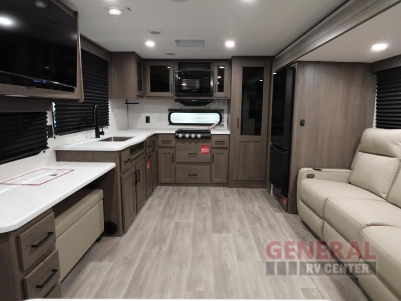 Step inside and be greeted by a beautifully appointed interior featuring two expansive slide-outs that enhance the living area, providing a generous and open feel. The well-equipped kitchen is a chef's dream, complete with top-of-the-line appliances and ample counter space, perfect for preparing gourmet meals on the go. The living area is designed for comfort, featuring plush seating and a state-of-the-art entertainment system, ensuring you can unwind in style after a day of exploration.