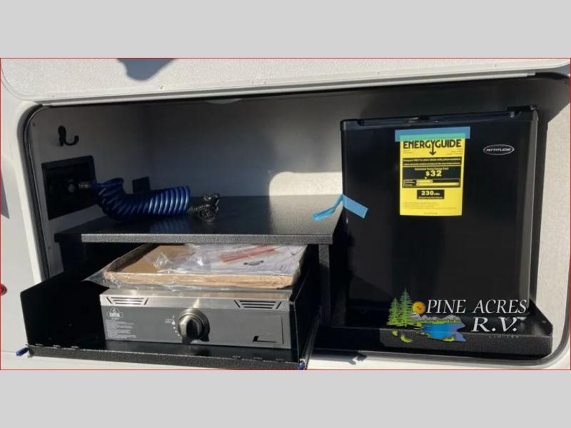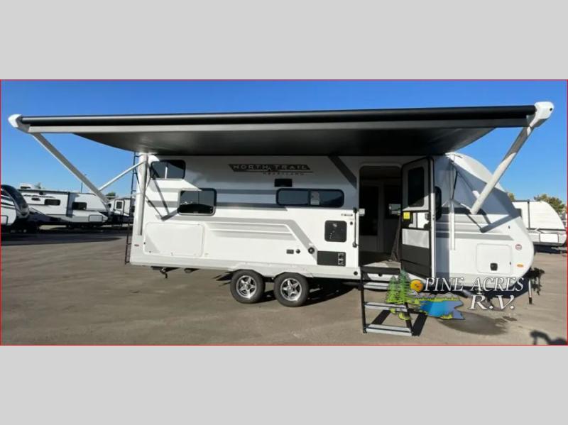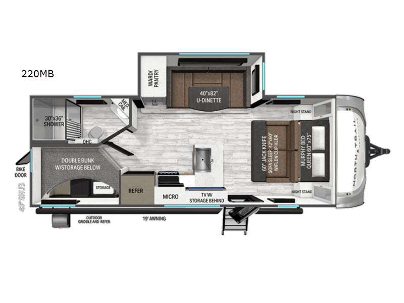 Step inside to discover a thoughtfully laid-out interior that maximizes space and utility. The North Trail 220MB features a spacious living area with a convertible dinette, providing ample seating for meals or relaxation. The well-appointed kitchen is equipped with a refrigerator, microwave, and a three-burner stove, all designed to make meal preparation a breeze. The sleeping area boasts a comfortable queen-sized bed, ensuring restful nights after a day of exploration. Additionally, the bathroom is fitted with a full shower and modern amenities, offering the convenience of home on the road.
