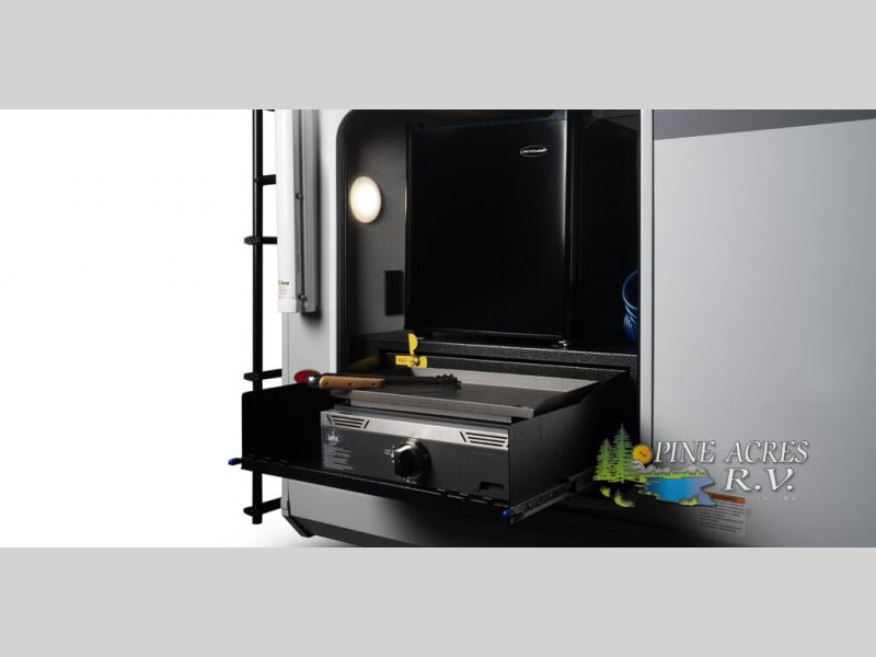 Step inside and you'll find a cozy living area with all the modern amenities you could wish for. The kitchen is fully equipped with a fridge, microwave, and a three-burner stove, making meal prep a breeze. The dinette comfortably seats four and can be converted into an extra sleeping area. The main bedroom features a plush queen-sized bed, ensuring a restful night's sleep after a day of adventure. Plus, the bathroom comes with a roomy shower and all the essentials, so you can freshen up with ease.