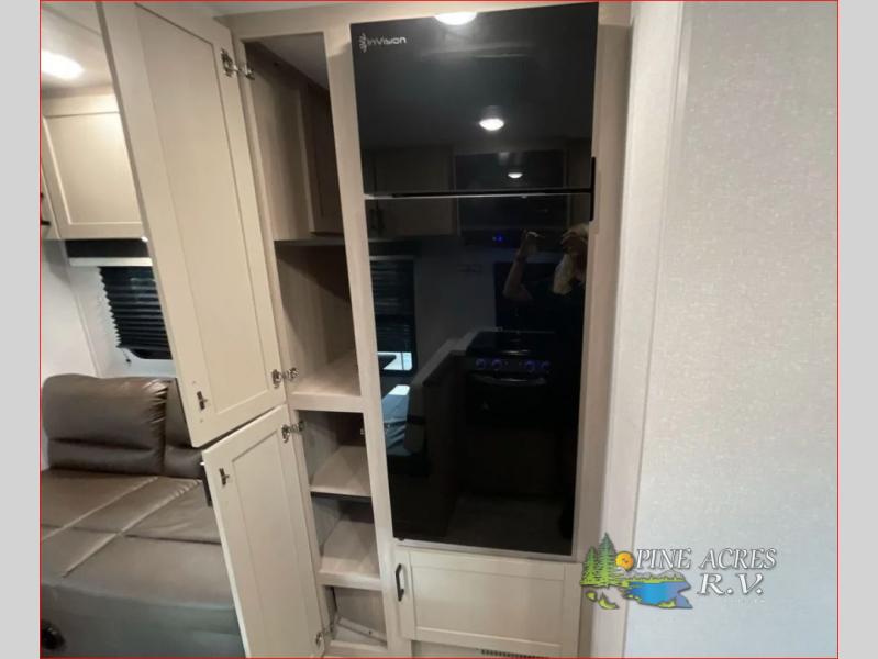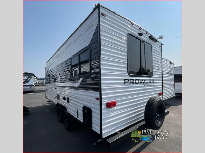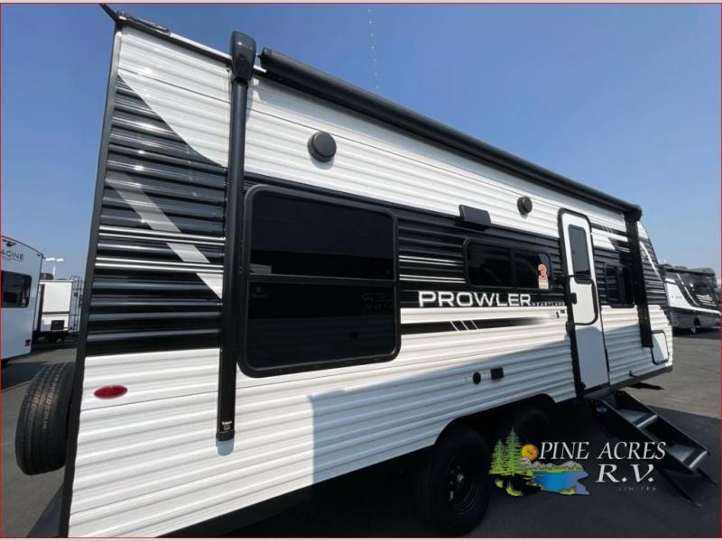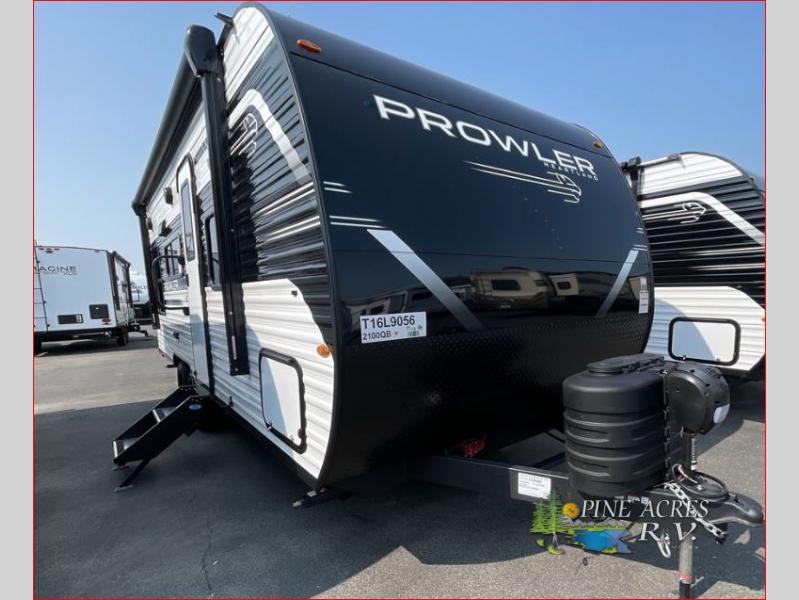 Step inside and you'll find a cozy living space that feels just like home. The Prowler 2100QB features a spacious queen bed, perfect for a restful night's sleep after a day of exploring. The kitchen is fully equipped with a fridge, microwave, and a three-burner stove, making it easy to whip up your favorite meals. Plus, there's plenty of storage space for all your gear and groceries. The dinette area is perfect for enjoying meals or planning your next adventure, and it easily converts into an extra sleeping space if needed.