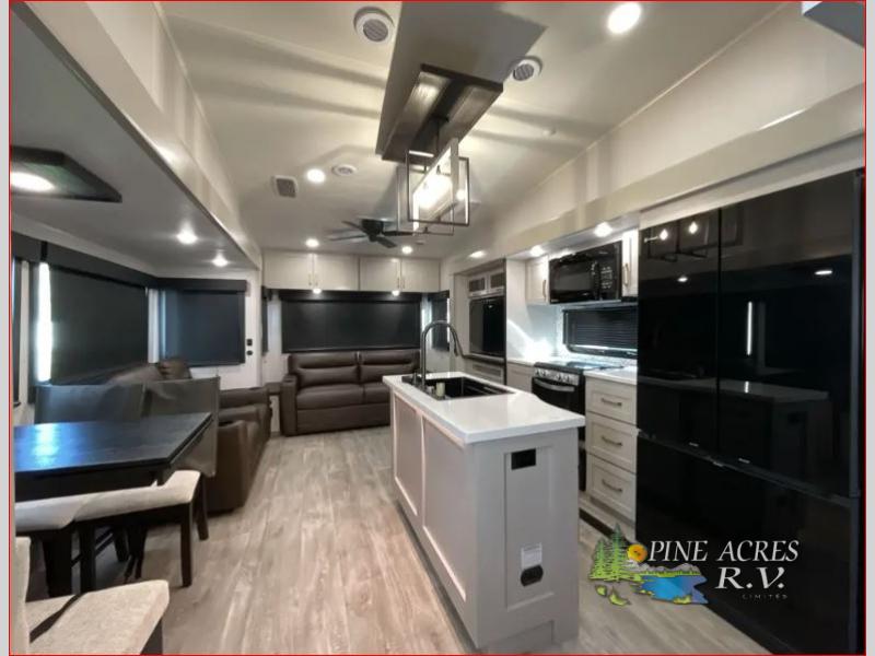 Step inside to discover a thoughtfully designed living area that boasts a modern aesthetic with premium finishes. The open-plan layout features a fully equipped kitchen with state-of-the-art appliances, including a large refrigerator and a three-burner stove, perfect for preparing meals on the go. The generous living space includes a cozy seating area with plush sofas and a flat-screen TV, ideal for relaxation after a day of adventure. The master bedroom offers a queen-sized bed and ample storage, ensuring a restful night's sleep. The bathroom is equally impressive, featuring a spacious shower and elegant fixtures.