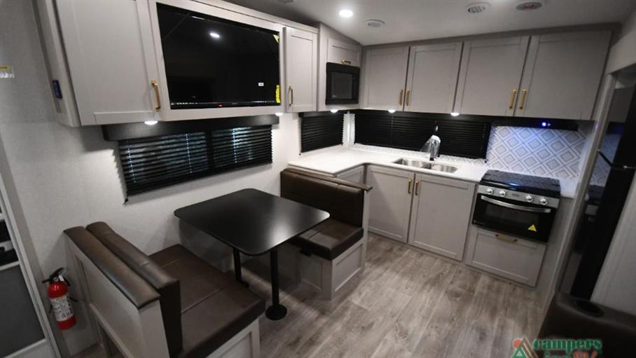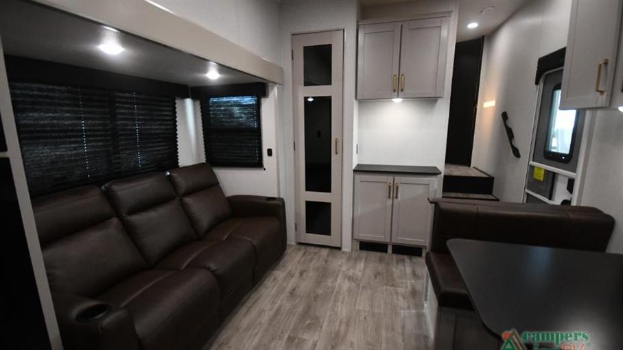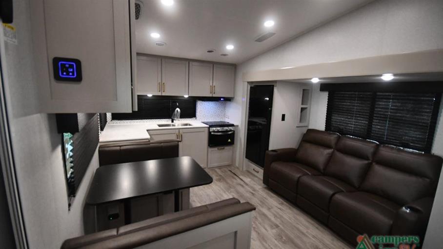Featuring two spacious slide-outs, this fifth wheel expands to offer ample living space, making it ideal for both short getaways and extended trips. Inside, you'll find accommodations for up to four people, ensuring that family and friends can join in on the adventure. The thoughtfully designed interior includes a cozy sleeping area, a fully equipped kitchen, and a comfortable living space, all crafted to enhance your travel experience.