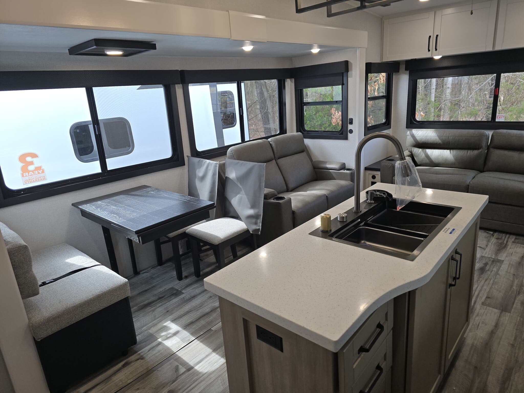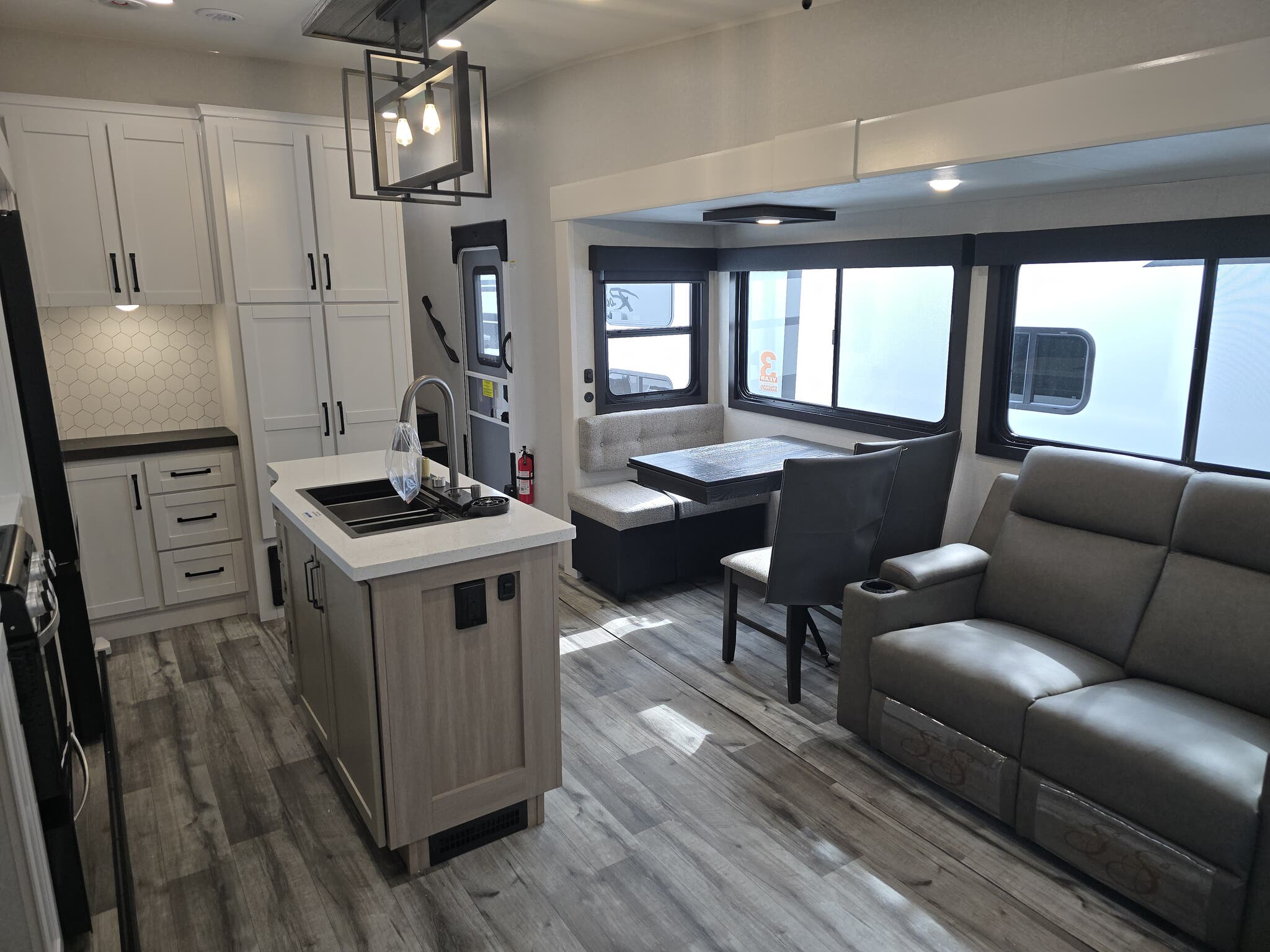 The Roamer 35MRQS features four slide-outs, expanding the living area to create a roomy and inviting atmosphere. With the ability to sleep up to eight people, this fifth wheel is perfect for families or groups seeking adventure without sacrificing comfort. The intelligently designed floor plan includes a master suite, bunkhouse, and convertible sleeping areas, providing privacy and flexibility for all occupants. The high-quality finishes and modern amenities make this RV a true home away from home.
