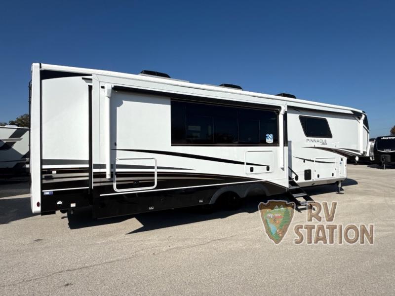 The Pinnacle 38FBRK boasts three expansive slide-outs, enhancing the living space to provide a truly open and inviting atmosphere. With the ability to comfortably sleep four, this fifth wheel is ideal for families or couples seeking a luxurious retreat on the road. The interior is thoughtfully designed with high-quality materials and finishes, ensuring a premium experience. The well-appointed kitchen, complete with modern appliances, allows for effortless meal preparation, while the elegant living area provides a cozy setting for unwinding after a day of exploration.