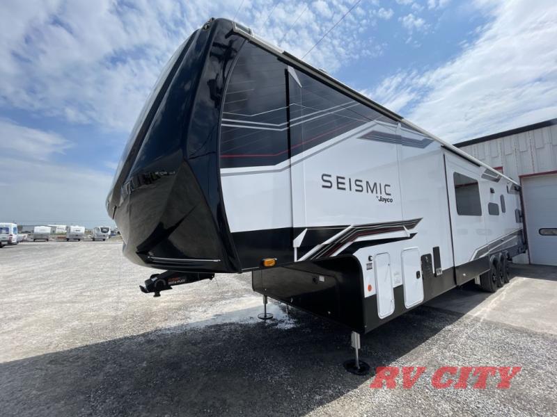 Discover the ultimate in luxury and adventure with the 2025 Jayco Seismic 399 Fifth Wheel, a masterpiece of design and functionality. This RV is perfect for families or groups looking to explore the open road without sacrificing comfort. With three spacious slide-outs, this model offers an expansive living area that transforms your travel experience into a home away from home. Measuring an impressive 38 feet in length, the Seismic 399 provides ample space for relaxation and entertainment, ensuring everyone has room to unwind.