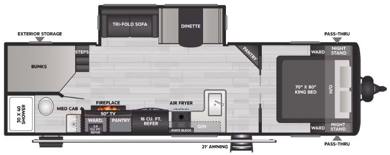Step inside to find a thoughtfully designed interior featuring a single slide-out that expands your living area, providing extra room for relaxation and entertainment. The well-appointed kitchen comes equipped with modern appliances, ensuring you can prepare delicious meals with ease. The cozy sleeping arrangements include a master bedroom, bunk beds, and convertible seating areas, ensuring everyone has a comfortable place to rest after a day of adventure. The lightweight design, weighing in at just 3,069 kilograms, makes towing a breeze, allowing you to explore new destinations without hassle.