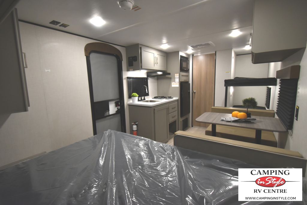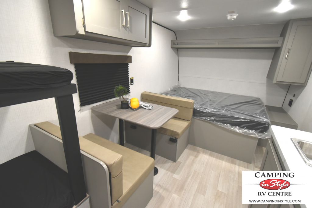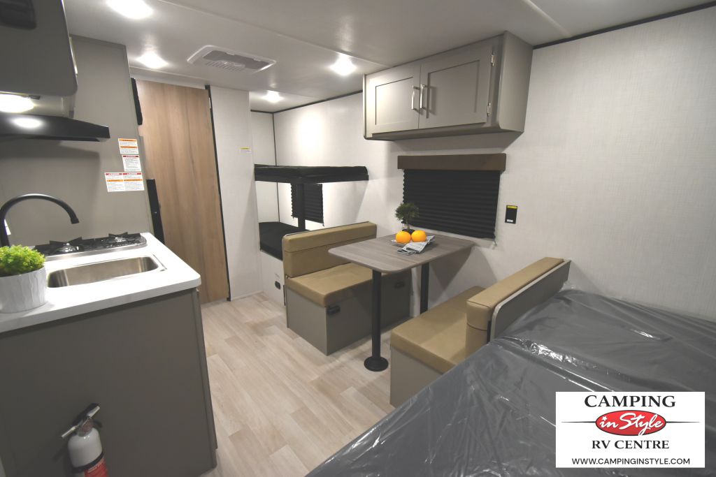 Inside, the Hideout Mini 161BH comfortably sleeps up to five people, making it the perfect choice for families or small groups of friends. The intelligently designed interior maximizes space and functionality, featuring a cozy sleeping area, a compact yet fully equipped kitchenette, and a versatile dinette that easily converts into additional sleeping space. Every inch of this travel trailer is optimized to ensure you have all the comforts of home while exploring the great outdoors.