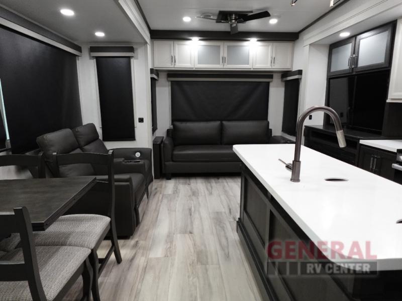 The Alpine Avalanche Edition 321RL boasts three expansive slide-outs, significantly enhancing the living space to provide a home-like atmosphere on the road. Inside, the RV comfortably accommodates up to four people, making it ideal for couples or small families seeking a luxurious getaway. The interior is thoughtfully designed with high-quality materials and finishes, offering a harmonious blend of style and practicality. The spacious living area is perfect for relaxation, while the well-appointed kitchen and dining space cater to all your culinary needs.