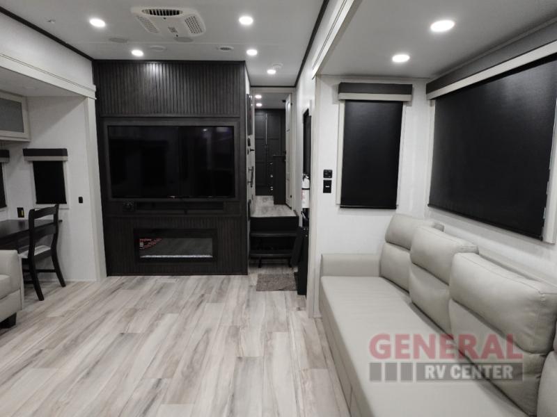 Inside, you'll find a thoughtfully designed interior that can comfortably sleep up to five people. The spacious layout includes a master bedroom with a plush queen-sized bed, a cozy sleeper sofa, and a convertible dinette, making it ideal for families or groups of friends. The modern kitchen is equipped with top-of-the-line appliances and ample counter space, allowing you to prepare delicious meals with ease. The living area is perfect for unwinding after a day of adventure, featuring a large flat-screen TV and a fireplace for those cooler evenings.
