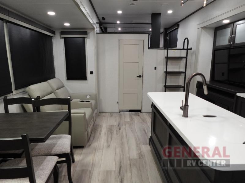 This fifth wheel boasts four slide-outs, significantly expanding the living area to create an open and inviting atmosphere. With the ability to sleep up to seven people, it is perfect for family adventures or group outings. The intelligently designed floor plan includes a master suite, additional sleeping quarters, and a versatile living area, providing privacy and convenience for all occupants. The high-quality finishes and modern amenities ensure a home-like experience on the road.