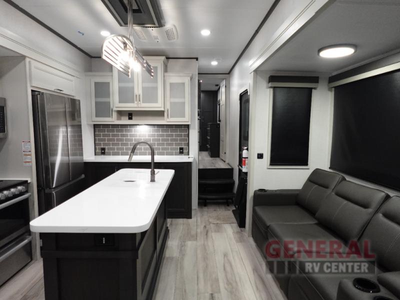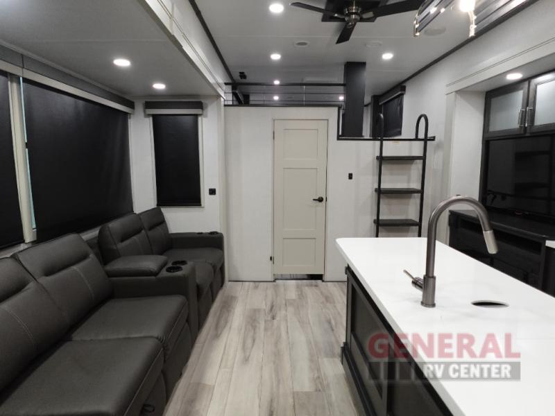 Weighing in at approximately 6,578 kilograms, this fifth wheel is engineered for stability and ease of towing, ensuring a smooth journey wherever the road takes you. The thoughtful design includes a master suite, a cozy bunkhouse, and a convertible living area, providing versatile sleeping arrangements to accommodate everyone. The interior is adorned with high-end finishes, modern appliances, and plenty of storage, making it a true home away from home.