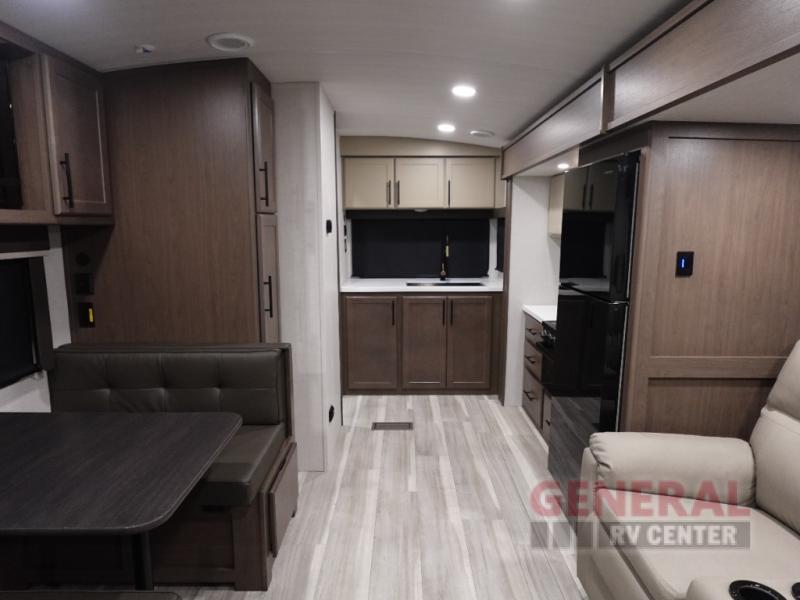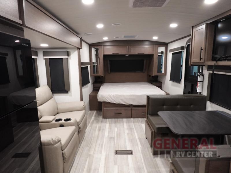 The Cougar Half-Ton 22MLS features a single slide-out, which significantly enhances the interior living space, providing a roomy and comfortable environment. This model is thoughtfully designed to accommodate up to three people, making it perfect for small families or couples seeking a cozy getaway. The interior is equipped with modern amenities and high-quality finishes, ensuring a luxurious experience on the road. The efficient layout includes a well-appointed kitchen, a comfortable sleeping area, and a stylish bathroom, all crafted to meet your needs while traveling.